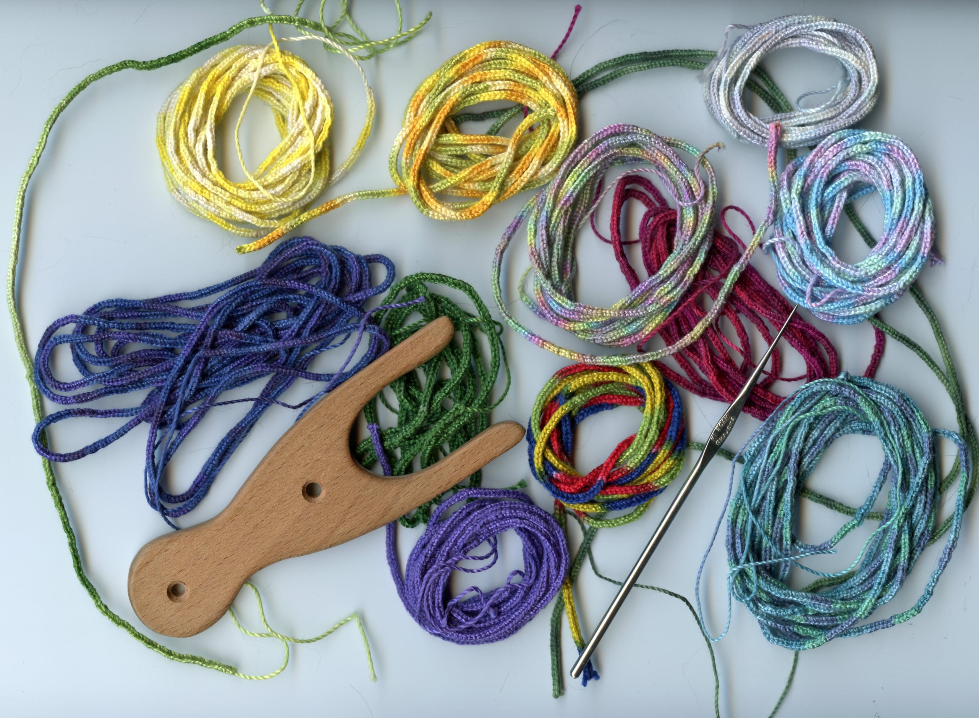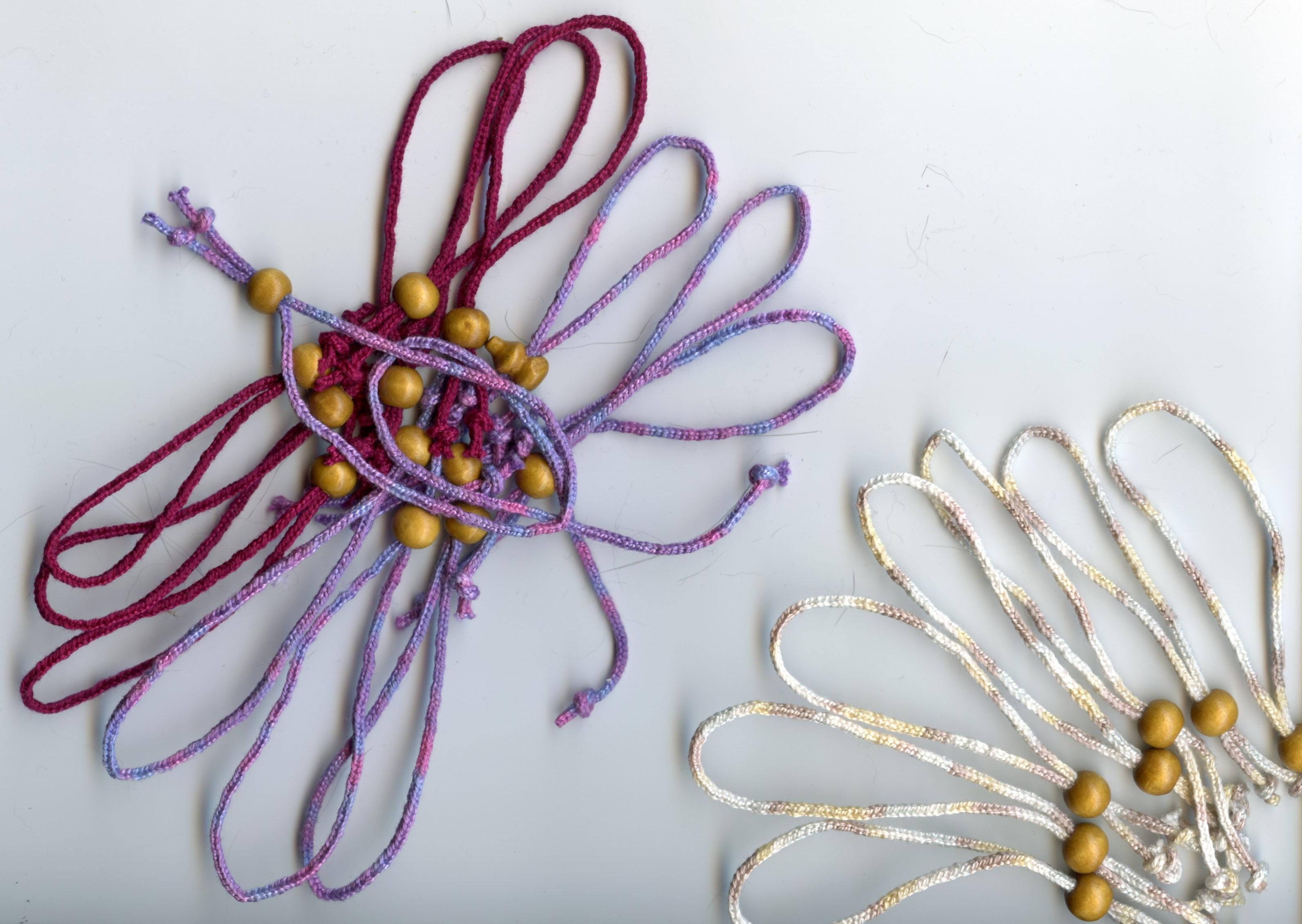 récupéré des perles de bois (cordons noués aux deux extrêmités, puis coupés, pliés en deux et passés dans la perle à l’aide d’une chute de fil et d’une aiguille à canevas) :