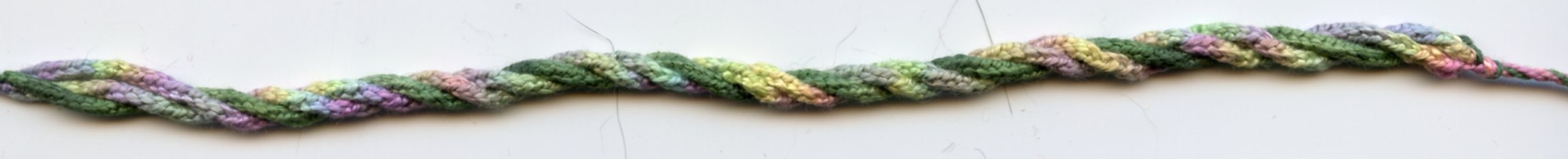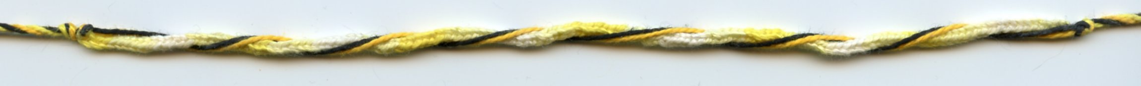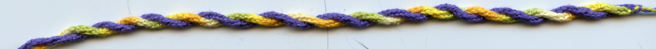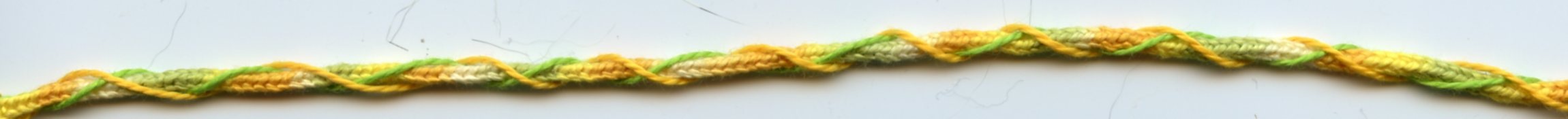 le dernier, le plus joli : 2 variations et 1 uni ; la torsion se fait sans diminution de longueur probablement à cause de l’élasticité du travail à la lucette ; on remarque que l’extrêmité gauche n’est pas régulière sur la glace du scanner : les noeuds de fixation de la torsade ont été faits après arrêt des cordons sur les 3 fils. Ce n’est pas suffisant. Faire les noeuds sur les trois cordons eux-mêmes.