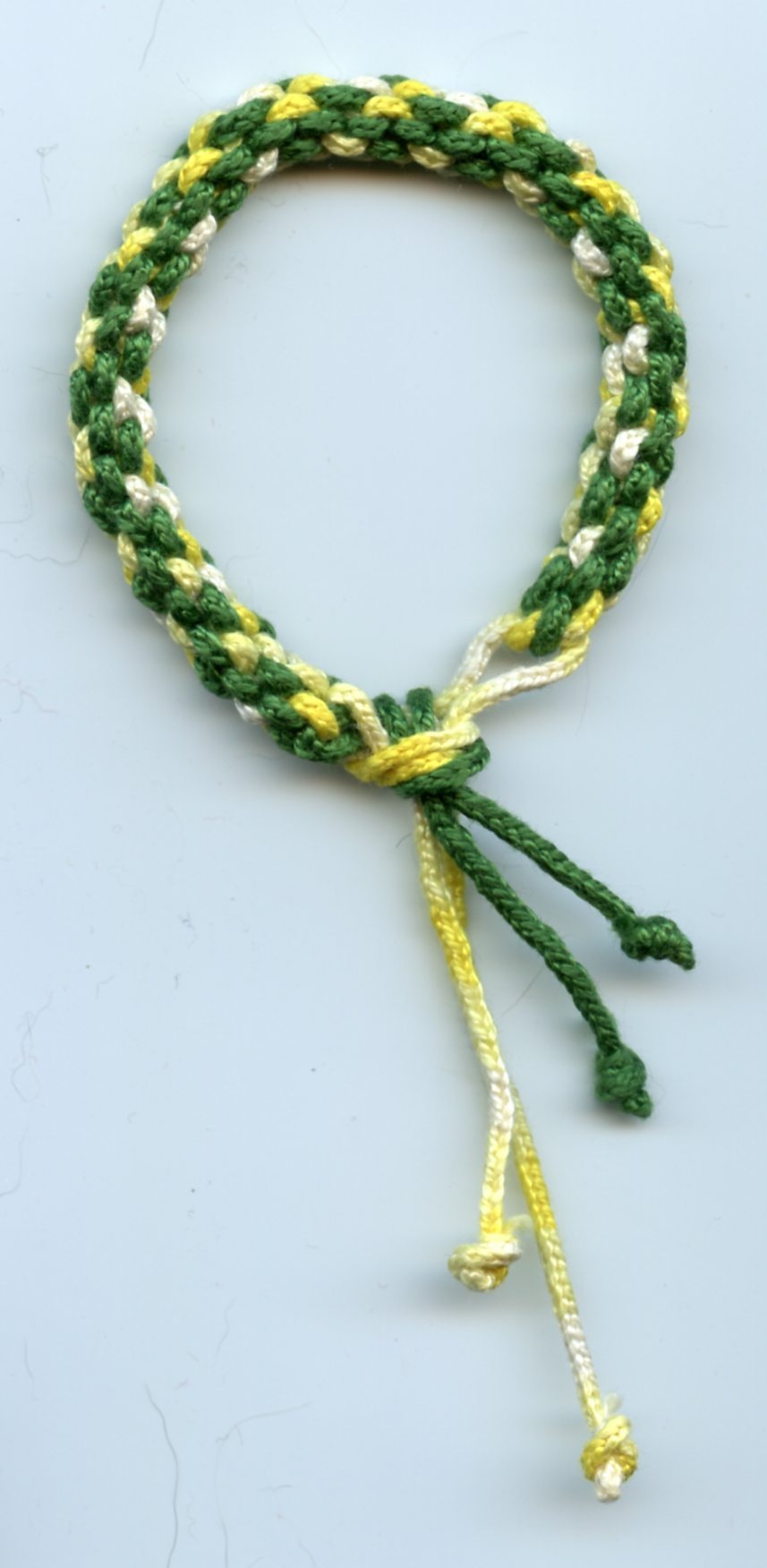 2,5 coudées de long de chaque couleur, plier en deux, montage du scoubidou à 4 brins – *[1 rang droit, 1 rang on croise, 1 rang droit, 1 rang on croise] recommencer à * – finitions 1 noeud en prenant le fil avec le cordon, couper à 1 mm du noeud, nouer les 4 brins avec la boucle de début