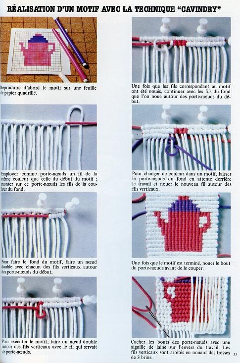 J’ai déjà mentionné pour ce faire la technique du macramé CAVENDOLI. Sur le site dont j’avais donné l’adresse, le fond était réalisé au moyen d’une très grande longueur d’1 fil noués en zigzag serrés.