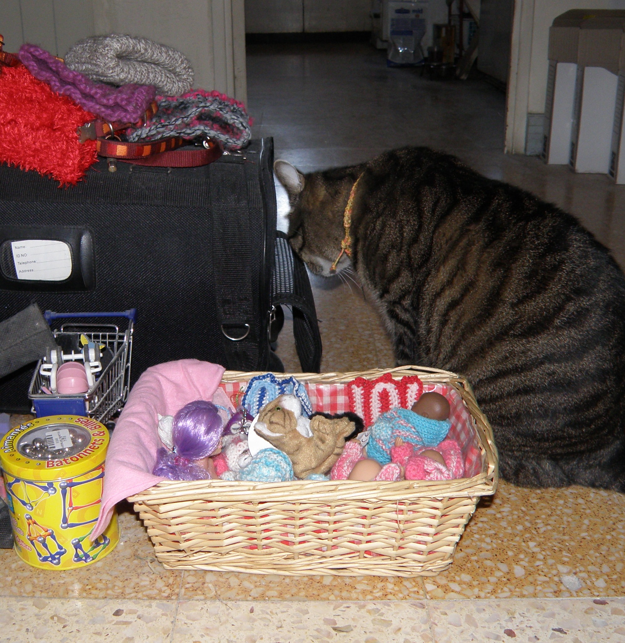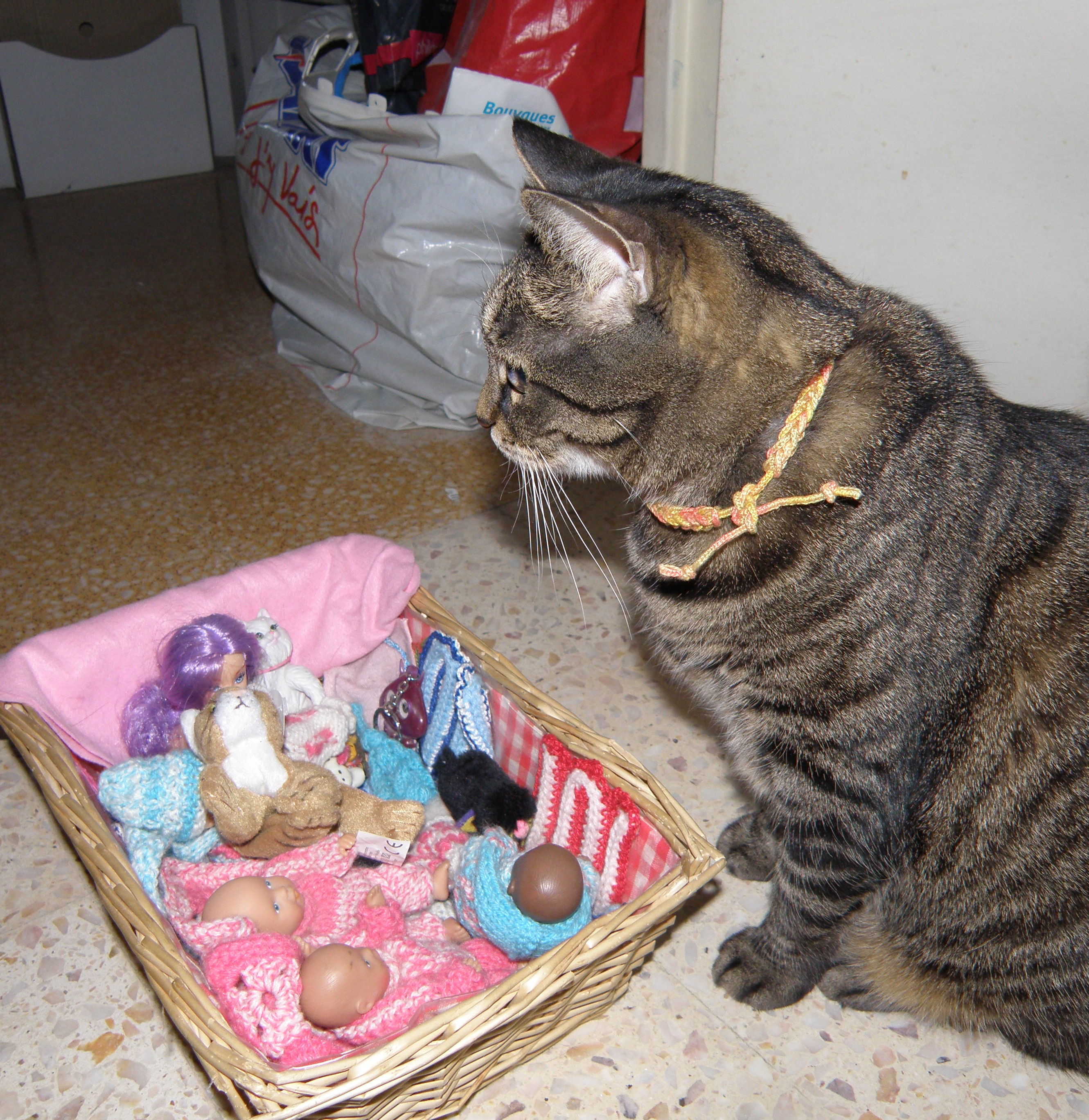 là, j’ai redressé moi-même le chaton en peluche. Maman a habillé mes bébés avec la plus fine laine layette qu’elle a pu trouver et qu’elle a tricotée avec deux aiguilles à boutis.