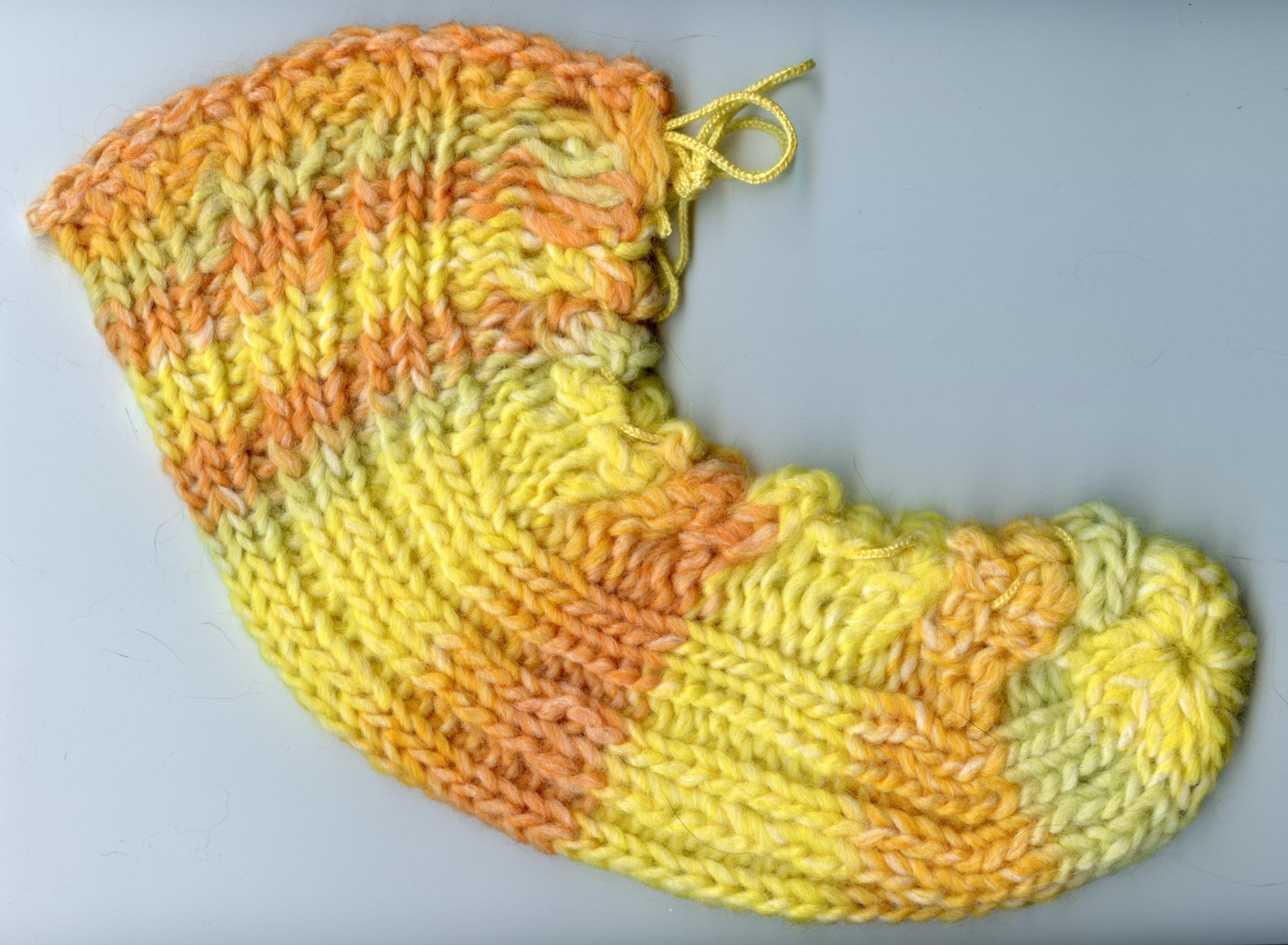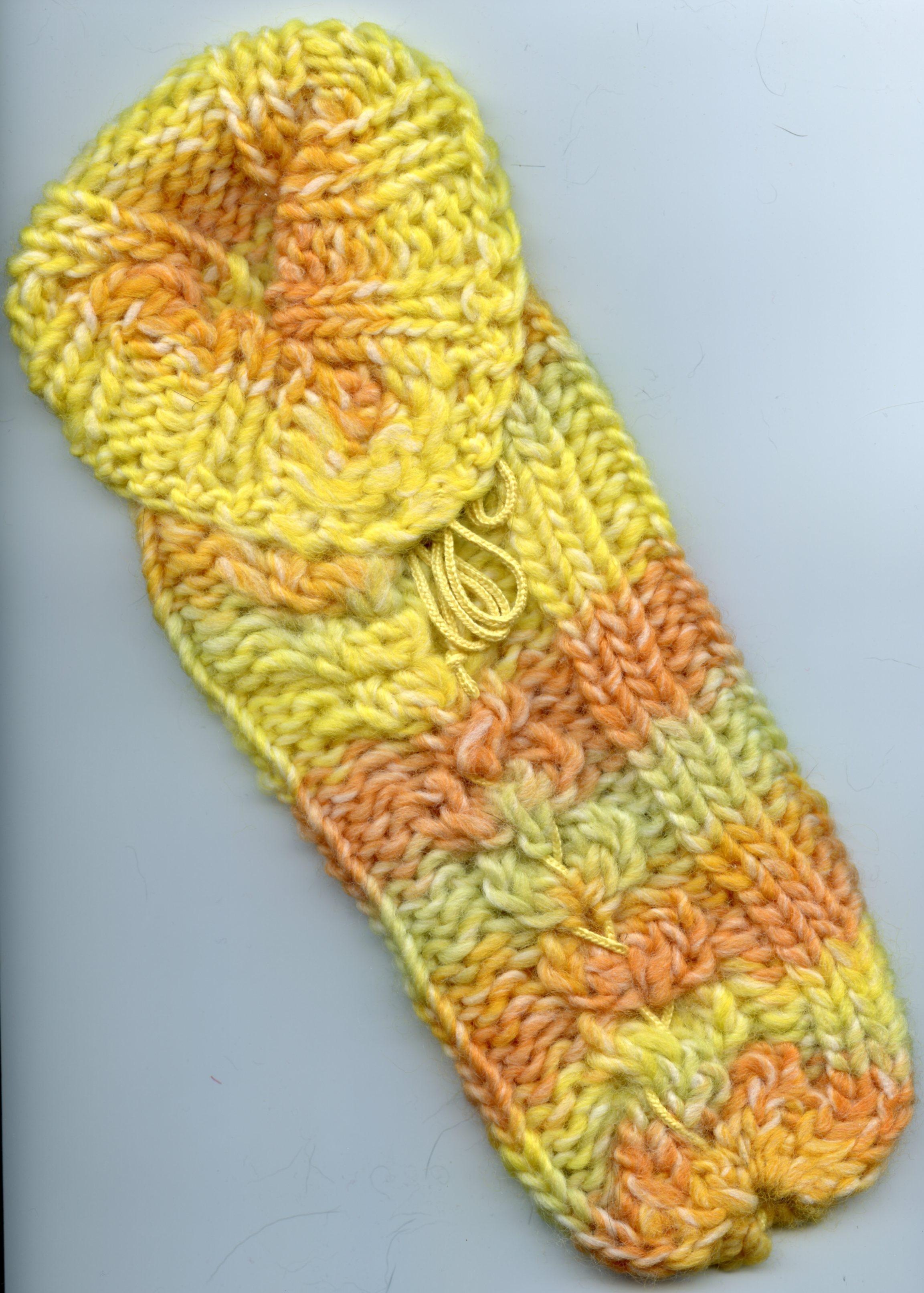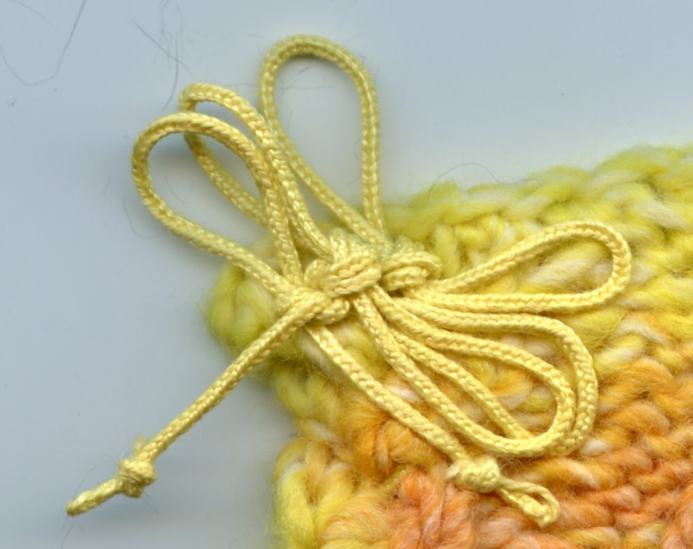 Avec le coton perlé N° 5 assorti à la laine des chaussons, faire un cordon à la lucette, en faire deux parties égales. Fermer la partie correspondant au montage, côté orteils, puis passer les deux brins de cordon tous les 5 rangs à travers les trois jours obtenus en sautant 1 plot comme si vous mettiez en place des lacets de chaussure. Serrer, le chausson étant sur votre pied, le motif en tresse de dessus apparaîtra ainsi que la courbure du talon. Cela fait, il reste assez de longueur de cordon pour faire trois nœuds successifs, en renouant les deux boucles ensemble à chaque fois pour qu’ils ne se défassent pas.