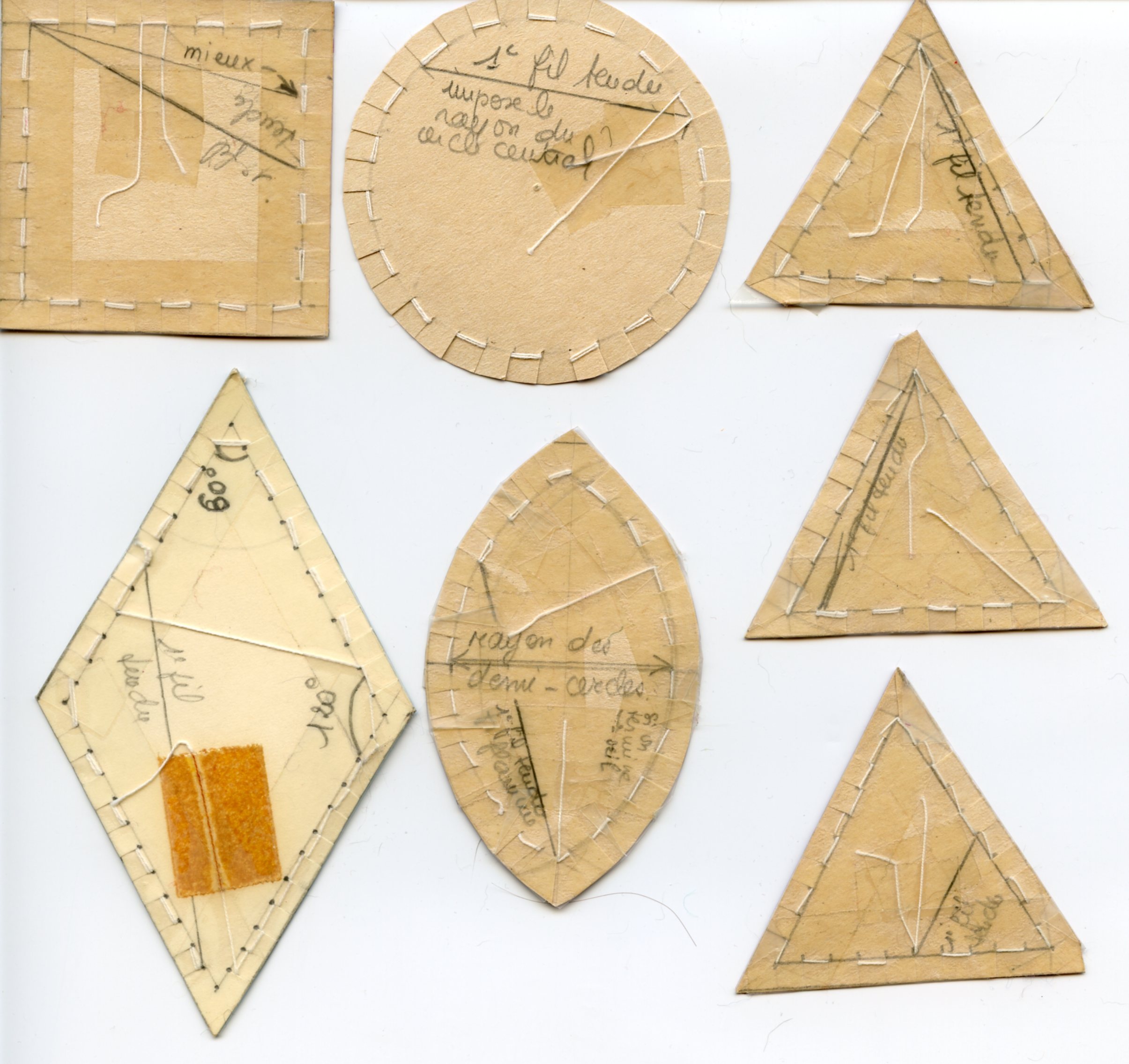 - au recto, lancer le fil à travers le support pour le glisser dans l’encoche correspondante à l’extrêmité du segment de droite pré-tracé au verso