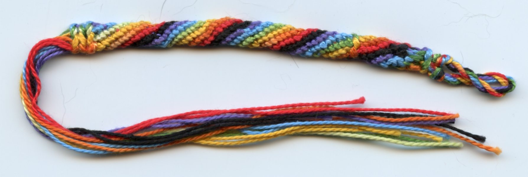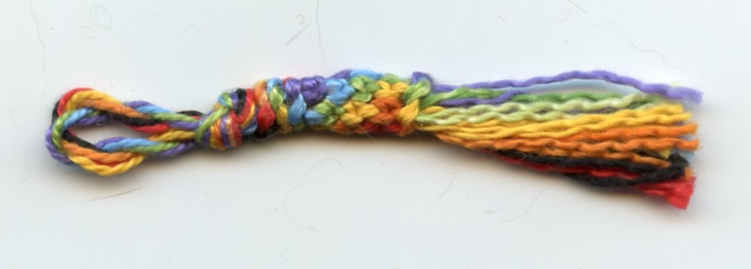 *[rang 2 : noir sur rouge, rouge sur orange, orange sur jaune, jaune sur vert, vert sur bleu, bleu sur violet – violet sur noir]* à reproduire jusqu’à ce que la partie nouée ait la longueur désirée