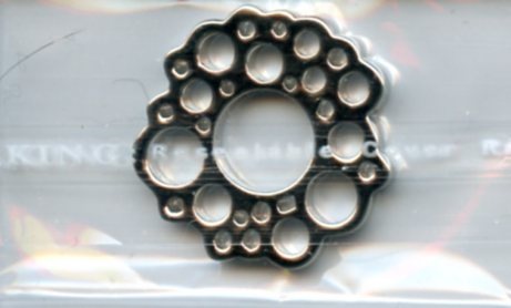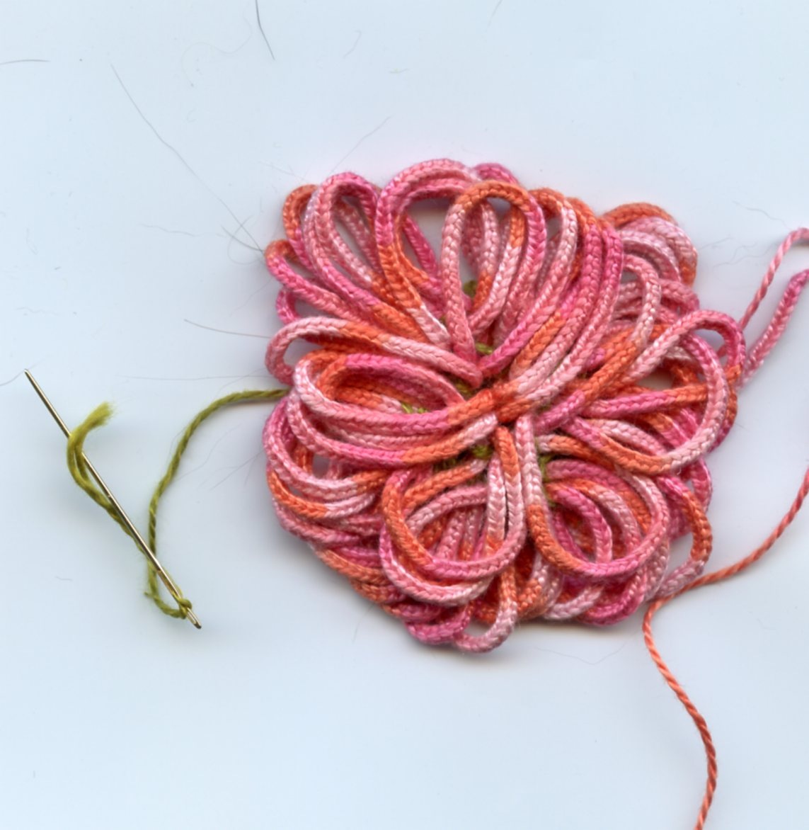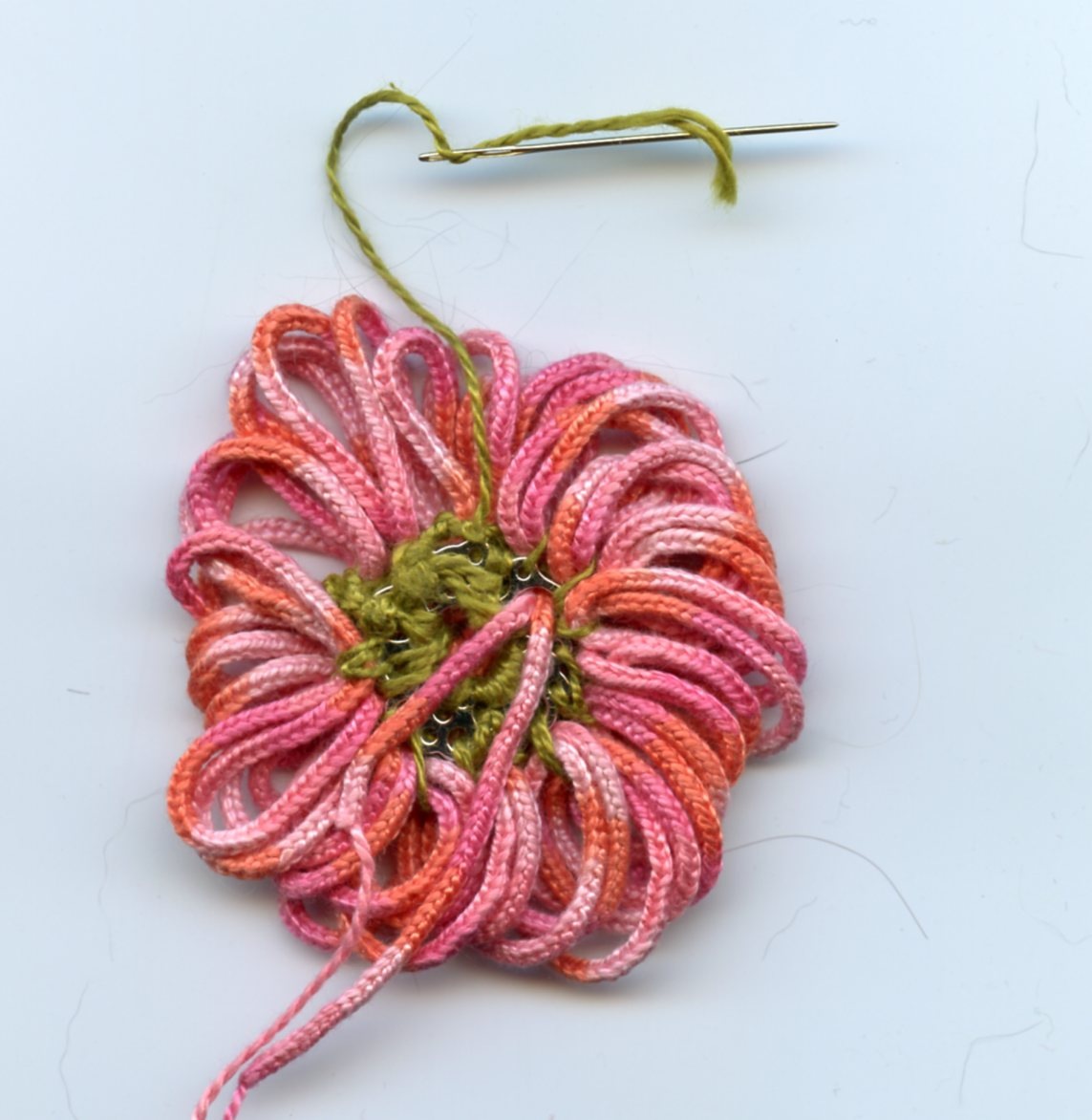 - *[avec le cordon pris en double, entourer l’index de la main qui tient une fois, fixer le double pétale formé au support en serrant très fort et en nouant le fil vert]* recommencer en allant progressivement vers la périphérie du support jusqu’à ce qu’il n’y ait plus de cordon libre ou qu’il n’y ait plus de place dans les trous du support pour passer l’aiguille enfilée