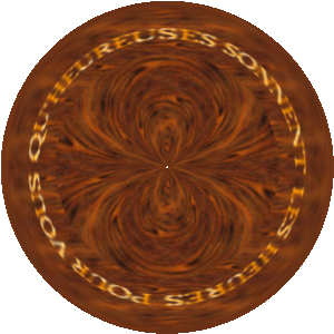 Scusez-moi tous les deux mais faut le temps qu\’il faut, quand même, suis pas pro de PhotoFiltre, moi. Ah, s\’il faisait mandala ou kaléidoscope… et cet adorable effet InsideOut, probablement en rapport avec la fonction inverse. Faudra que je vérifie un jour chez Géraud BOUSQUET http://pagesperso-orange.fr/hypatiasoft/F_index.html . Super pour ça son applet JAVA de bas de page "Déformer une image par une transformation conforme". C\’est là que je dis que les Mathématiques sont jolies. Et que je comprends Léopold Sédar SENGHOR : "Les Mathématiques sont la poésie des Sciences".Si vous officialisez, Morphée et toi, ça va te faire une sacré famille. Beau travail du bois dis donc.Je viens d\’essayer d\’avoir "heures" tout seul, il m\’a fallu augmenter la netteté au maximum 4 fois et ajuster luminosité et couleur une pour que ça soit net à mes vieux yeux. Mais je n\’aime pas : j\’avais mis le "calque provisoire" d\’écriture un peu transparent et ça parasite. Là il faudrait tout refaire et je tiens mon idée pour GUE, j\’y vais de ce clic.