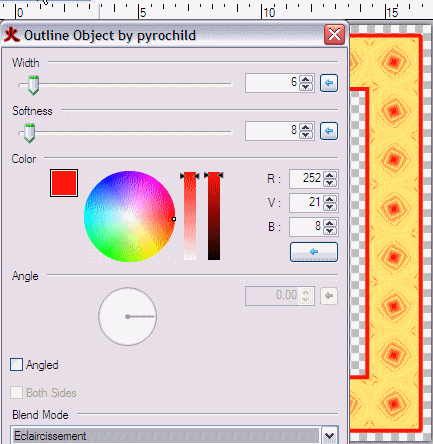 Repérons la couleur rouge du centre des motifs avec l’Outil Sélecteur de couleurs, puis Effets/Objets/Outline objects