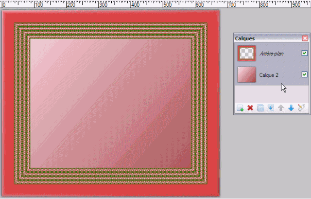 Ajoutons la largeur totale de bois (plat et biseaux) autour et, sur un autre calque (Calque 2), un gradient en couleur assortie à celle du bois diagonalement par rapport au rectangle total. La couleur la plus claire est en haut à gauche, la couleur la plus sombre en bas à droite. Ces deux teintes encadrent celle du bois. Faisons descendre Calque 2 en dessous de l’Arrière-plan qui porte notre dessin initial.