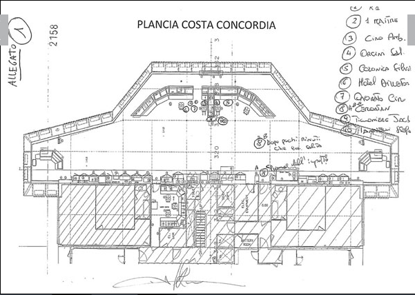 Voici l’un des plans de la passerelle réalisé par l’un des officiers témoins au moment où il y avait 10 officiers présents sur les lieux. Tous les officiers sont réquisitionnés en cas d’alarme générale, ils sont donc tous venus et le Commandant SCHETTINO leur a attribué des missions auprès de lui et sur le terrain selon ses besoins. Il m’est impossible de faire une liste générale précise car cela changeait tout le temps et il existe une bonne dizaine de plans de la passerelle semblables réalisés par le même officier témoin pour les enquêteurs, qui ont été publiés dans un diaporama de la presse italienne.