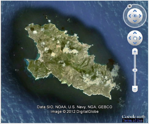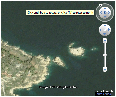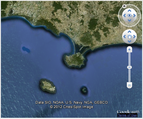 11 clics sur “+” et un petit mouvement vers le bas en suivant la côte ouest de l’île, et vous vous calez sur ceci, avec un port en bas de la première l’anse oblique du haut de l’écran : le Port du Giglio, vous reconnaissez les deux digues construites par la main de l’homme. Plus haut, en face de l’entrée du port, une double pointe s’avance dans la mer, la Concordia est échouée devant la pointe inférieure. Plus bas que le Port du Giglio, presque en face du signe “+” sur l’image, le groupe d’écueils de Le Scole.