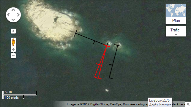 1. étude de la position du rocher blanc par rapport aux trois écueils du SCOLE sur une vue par satellite en 2D de Google Earth
