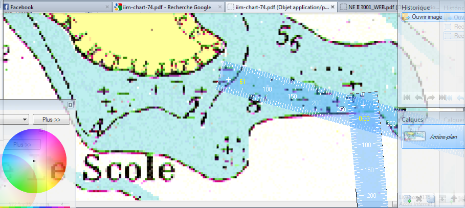 Copier ; Calque / Coller sur un autre calque ; placer bien au centre de l’image pour pouvoir l’incliner entière ; Calque / Faire tourner le calque afin de pouvoir la placer au mieux entre le gros écueil de Le Scole et le premier petit écueil noir