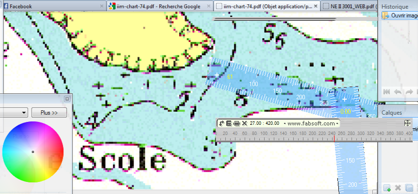 Calque / Dupliquer le calque ; Effets / Color / Color Flip/Rotate et on choisit ici le rouge ; Déplacer jusqu’au premier petit écueil du Scole rouge