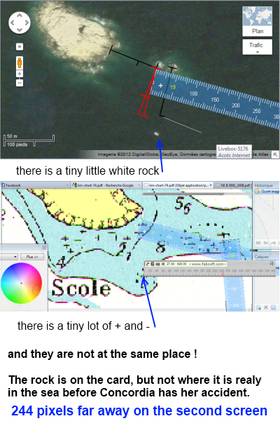 Au point où j’en suis dans ma pensée, j’ai voulu comparer le blanc du rocher qui est encore dans le flanc de la Concordia avec celui de cet écueil trop blanc en me plaçant dans les mêmes conditions de mesure. Donc, je suis revenue sur les cartes de Google Earth.