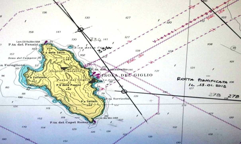 C’est une carte papier. Il est même précisé que c’est la carte nr. 6 – échelle 1:100.000 du service hydrographique Italien. Les angles sont différents de ce qui apparait sur l’écran radar, c’est pourquoi je demande quand et par qui. Il se pourrait très bien que cette carte ait été tracée après l’accident par quelqu’un qui tentait de comprendre et qu’elle ne reflète pas la carte d’origine qui, si elle existe, doit se trouver en mauvais état dans le navire et certainement moins lisible que celle-ci.