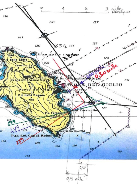 « Erreur sur le relèvement de la pointe, 239° au lieu de 249°, comme on peut le voir sur le plan ci-dessous. Le navire est venu à droite sans attendre d’être au way-point, surtout à cette vitesse, mais cette erreur sur le relèvement «programmé» de la pointe de Torricella pourrait bien être à l’origine du drame. »