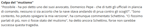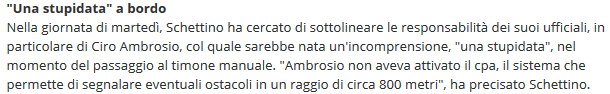 Pendant la journée de mardi, SCHETTINO a essayé de faire comprendre les responsabilités de ses officiers, en particulier celle de Ciro AMBROSIO, avec lequel il y aurait eu une incompréhension, une « bêtise », au moment du passage au timon manuel. « AMBROSIO n’avait pas activé le CPA, le système qui permet de signaler d’éventuels obstacles dans un rayon d’environ 800 mètres », a précisé SCHETTINO.