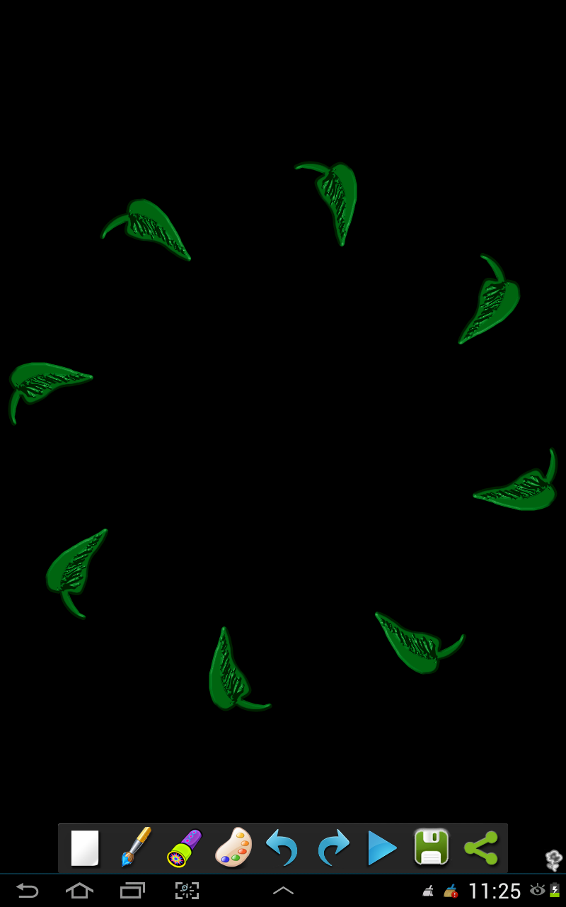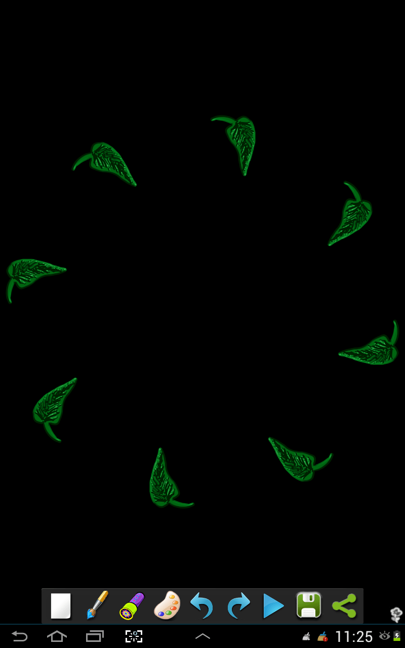 de la nervure centrale vers le bord, traçons de petits traits jointifs en levant le stylet entre chaque,