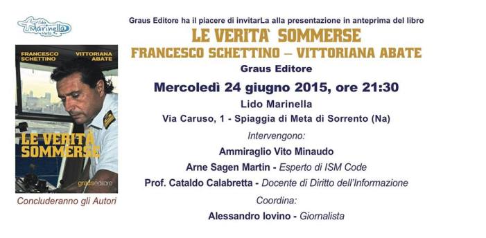 Y seront présents Francesco SCHETTINO et Vittoriana ABATE, les auteurs du livre, et interviendront des experts du secteur, parmi lesquels l’Amiral Vito MINAUDO, le Professeur Cantaldo CALABRETTA, professeur de Droit de la Communication, et Arne SAGEN MARTIN ingénieur naval norvégien expert de ISM Code (International Safety Management Code) et membre de la Fondation SKAGERRAK pour la Sécurité en Mer.