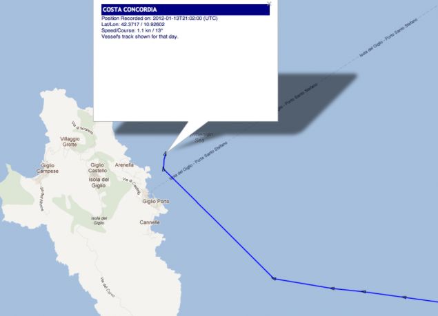 Le site Marine Traffic a publié l’heure précise de cet arrêt d’émission de sa position par la CONCORDIA, je n’ai retrouvé que cette image-ci :