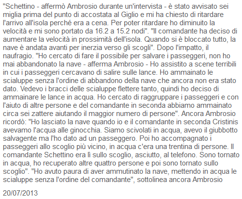 Je le cite : « Il comandante ha deciso di aumentare la velocità in prossimità dell’isola. Quando si è bloccato tutto, la nave è andata avanti per inerzia verso gli scogli ».