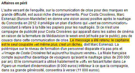 COSTA a attaqué dès les premières heures son capitaine, dit Monsieur ESKENAZI, parce que la compagnie craignait qu’on croie qu’elle était COMPLICE avec lui« .
