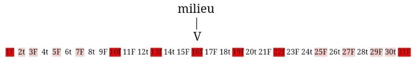 Du rouge pour les lisières, soient 1Fdble et 2t et 3F, 5F, 7F. Ça fait 4 à l’aller, 1 au retour. Pareil en symétrique, soient 25 F, 27 F, 29 F, 30 t et31F.
