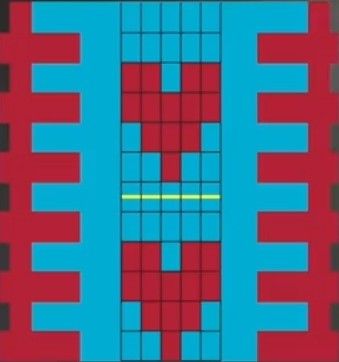 Du rouge dans les 5 fentes courtes pour travailler facilement le motif, soient 10f, 13f, 16f, 19 f et 22f. En double pour donner du volume au motif.