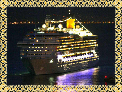 voici enfin le paquebot italien Costa Concordia quittant le port de Civitavecchia le soir du 13 janvier 2012 :