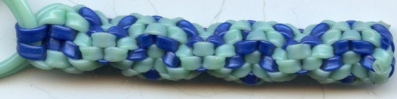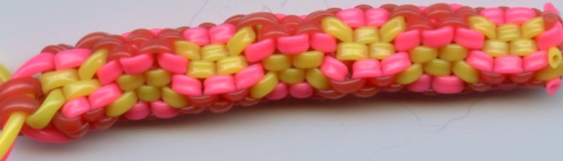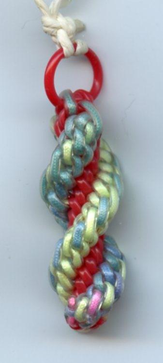 - souvenir, souvenir… d’un temps où il fallait trouver un détaillant en petit matériel électrique, acheter du fil au mètre et réussir à récupérer une longueur de plastique suffisante (l’inverse de dénuder un fil, pouvez-vous imaginer le travail et les inévitables catastrophes ?), ensuite nous arborions triomphalement sur nos sacs nos scoubidous carrés ou ronds, en enviant la technique des mystérieux prodiges qui avaient fait les parapluies qui trônaient dans la vitrine du boulanger du coin, bien plus gros et colorés que cette ébauche